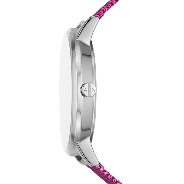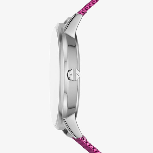 Đồng hồ 36mm của Armani Exchange có mặt số tia nắng mặt trời màu xám, chuyển động ba kim và dây đeo lưới bằng thép không gỉ màu hồng.