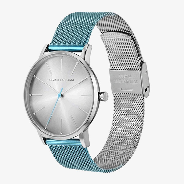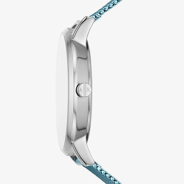 Đồng hồ 36mm của Armani Exchange có mặt số tia nắng mặt trời màu xám, chuyển động ba kim và dây đeo lưới bằng thép không gỉ màu xanh.
